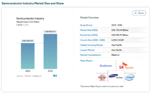According to the Semiconductor Industry Report 2025–2030 by Mordor Intelligence, the global semiconductor market is projected to reach USD 950.97 billion by 2030, growing at a CAGR of 6.25% from USD 702.44 billion in 2025. Unit shipments are expected to rise from 1.04 trillion to 1.43 trillion, reflecting robust demand across computing, automotive, industrial automation, and consumer electronics.